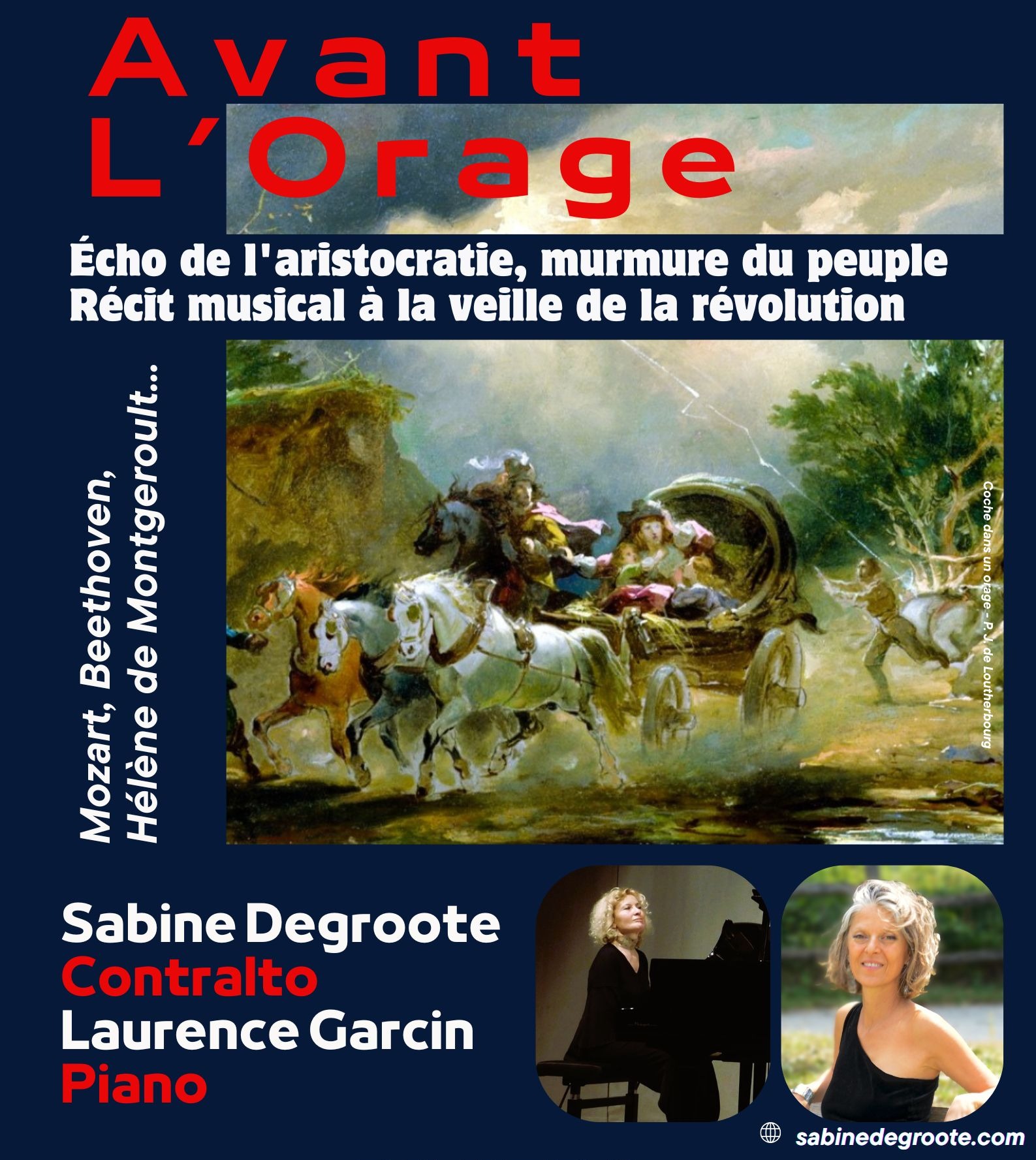 A travers les mélodies des compositeurs emblématiques de cette période, évoquant à la fois la grâce d'une époque finissante, et la gravité annonçant le chaos à venir, ce récital est une invitation à ressentir la tension croissante entre une partie de l’aristocratie, insouciante, et un peuple dont la patience arrive à bout. Une soirée qui ravive, par la magie des notes et des mots, les prémices d'un bouleversement majeur.